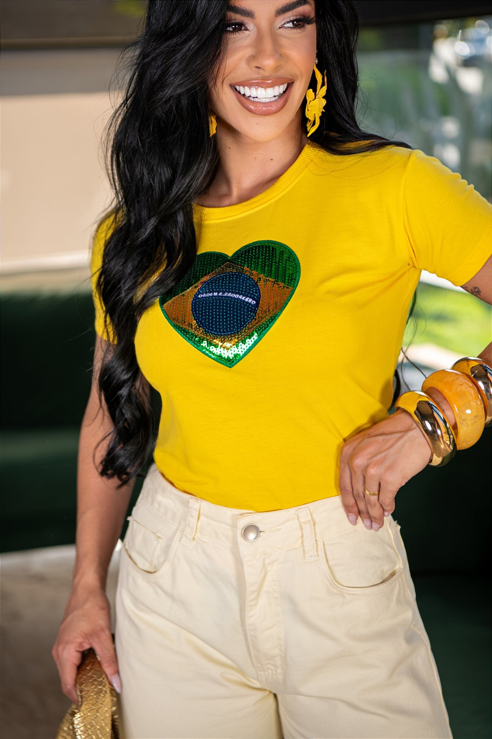 TSHIRT BRASIL CORACÃO BORDADO LANTEJOULAS - AMARELA
