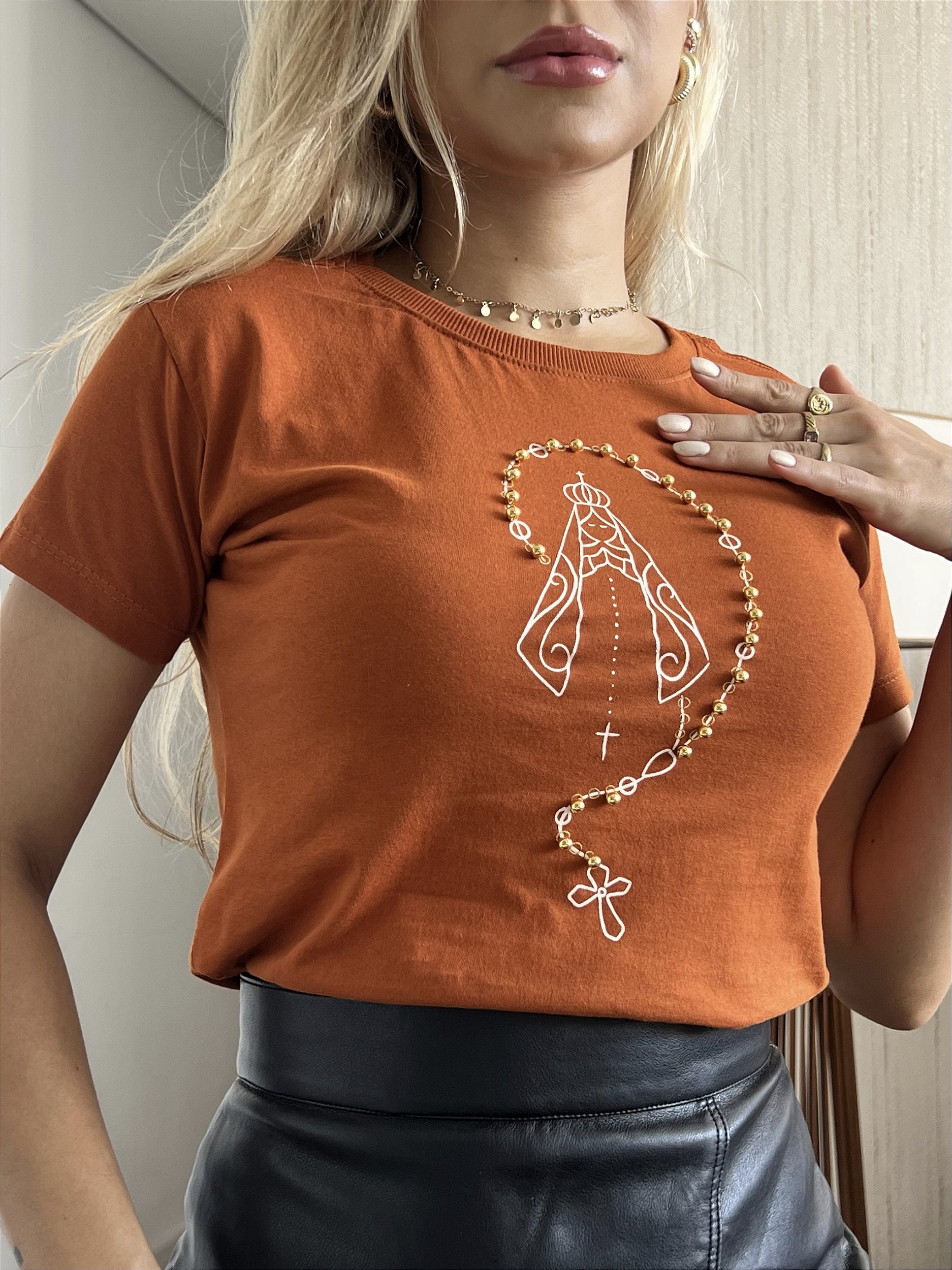 ESSA É UMA TSHIRT COM APLICAÇÕES EM PÉROLAS.