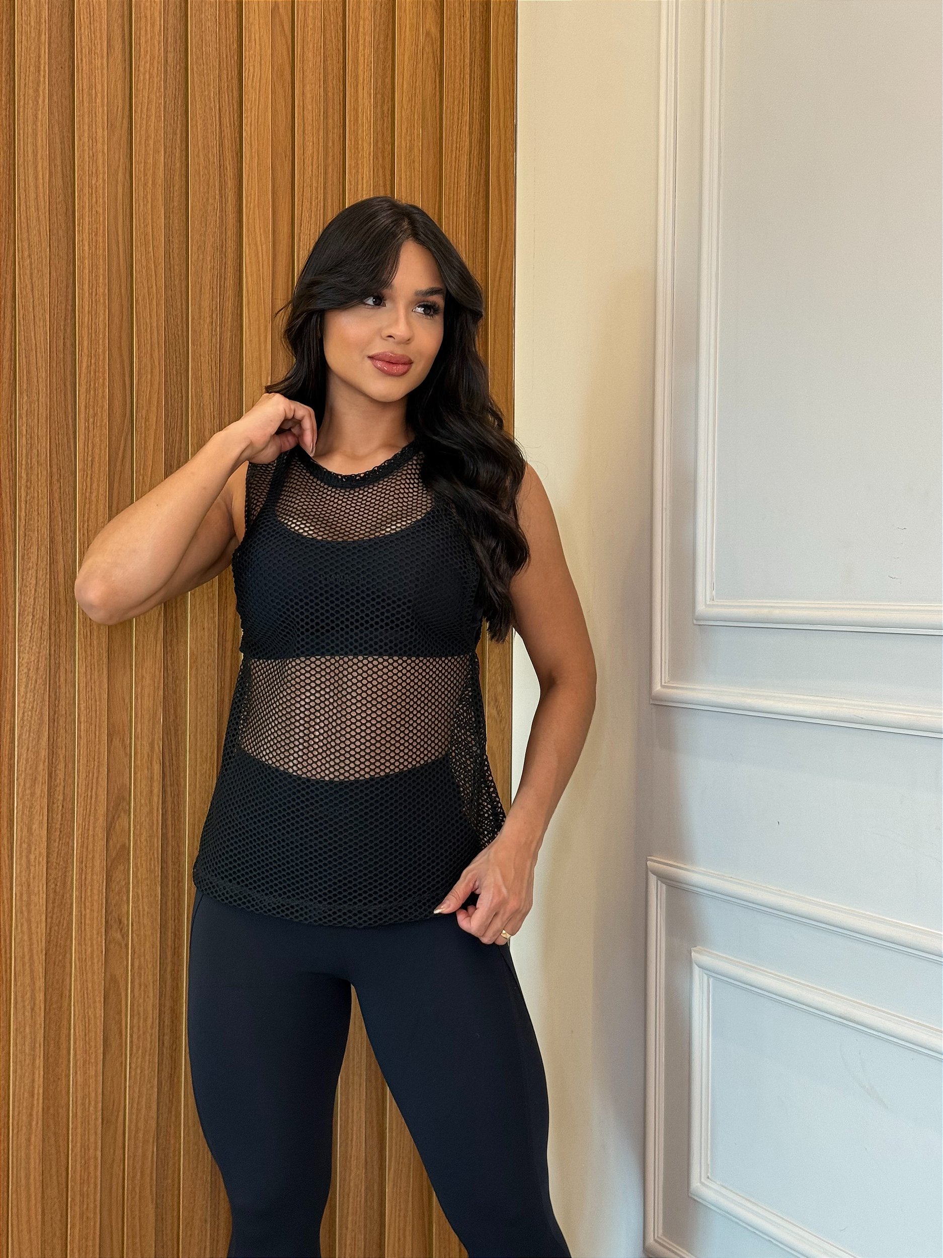 malha square (arrastão) 97% poliester 3% elastano.                                                                                                                    Leve, moderna e cheia de atitude, a Regata Arrastão  é perfeita para compor looks fitness estilosos e confortáveis a regata Arrastão  é confeccionada em tecido arrastão de alta qualidade, proporcionando ventilação e frescor durante os treinos nos tamanhos P M G e GG. Seu design valoriza a silhueta e confere um toque fashion ao visual esportivo. As cavas amplas garantem liberdade total de movimentos, sendo ideal para usar com tops estilizados por baixo.