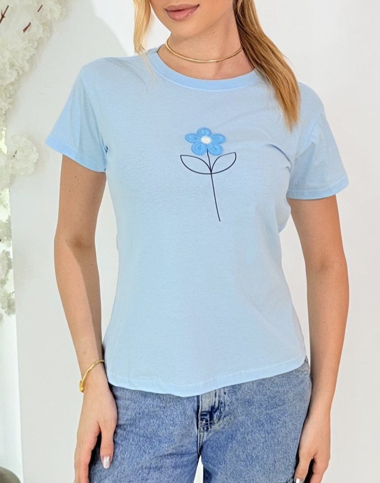 TSHIRT FEMININA FLOR BORDADA- AZUL BEBÊ