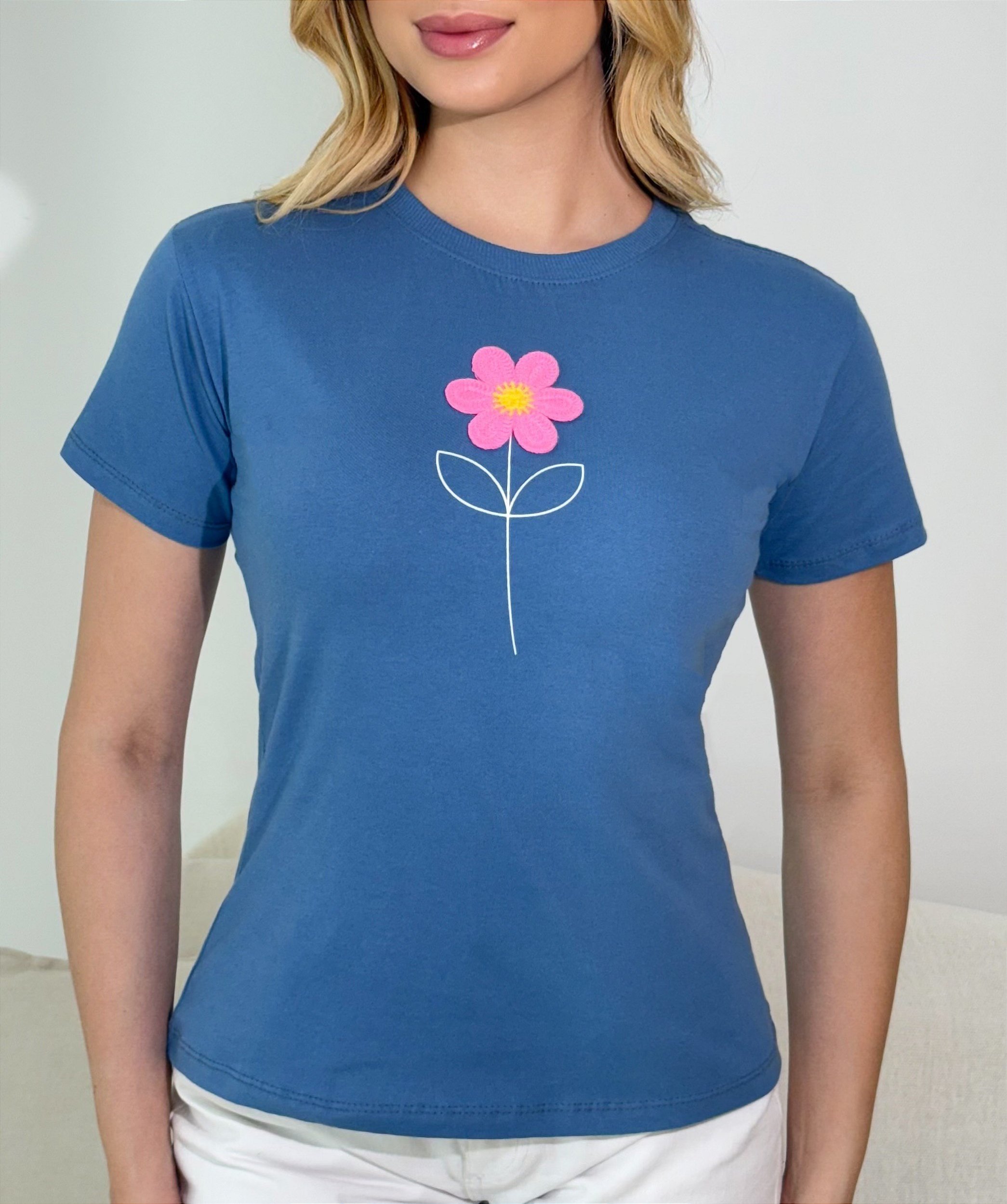 TSHIRT FEMININA FLOR BORDADA- AZUL JEANS